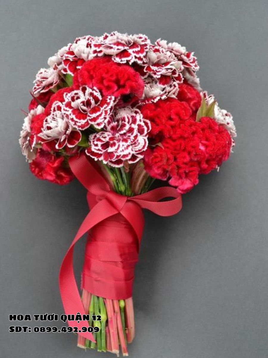 Màu đỏ là biểu tượng kinh điển của tình yêu nồng cháy và niềm đam mê không giới hạn. Bó hoa cẩm chướng đỏ được nhiều cô dâu yêu thích vì nó không chỉ tôn vinh tình yêu sâu đậm mà còn mang lại cảm giác may mắn và thịnh vượng cho cuộc sống hôn nhân.