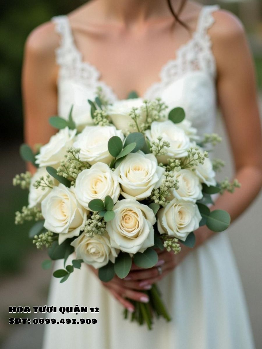 Hoa hồng trắng: Biểu trưng cho sự tinh khiết, ngây thơ và tình yêu không vụ lợi. Đây là lựa chọn lý tưởng cho cô dâu yêu thích sự tối giản, thanh lịch.